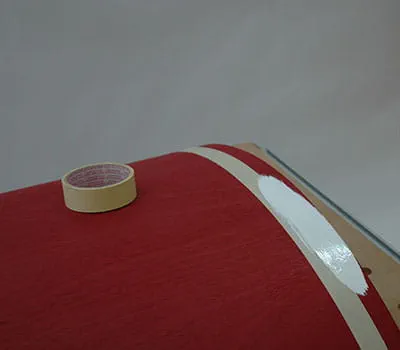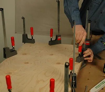 Aby ste si uľahčili neskoršie umiestňovanie, je dôležité zaznačiť si presah strechy. Na zlepenie použite opäť PU lepidlo. V tomto pracovnom kroku musíte pracovať vo dvojici. Takisto odporúčame vyskúšať si to celé najprv „nasucho“ (bez lepidla). Naneste lepidlo na strešné nosníky a zafixujte obloženie na vonkajšej hrane.