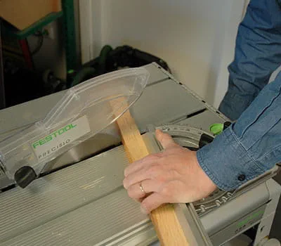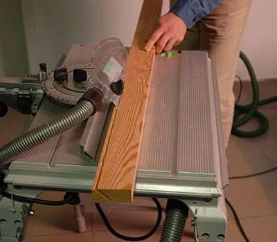 Aby ste dosiahli presnú reznú hranu, predkmit priamočiarej píly nastavte do polohy 1. Vyrežte s úkosom pomocou stolovej kotúčovej píly ukončovacie strešné lišty podľa ich dĺžky. Pri pozdĺžnych rezoch do masívneho dreva je nevyhnutné používať hrubý pílový kotúč. Odrežte dĺžku líšt pomocou stolovej kotúčovej píly.