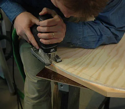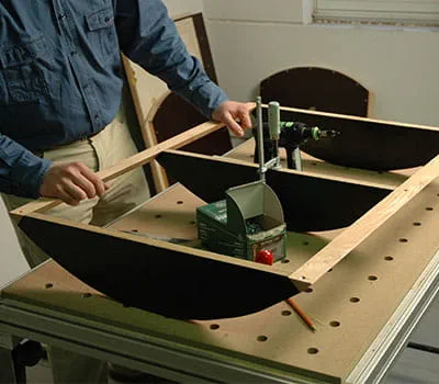 Upnite spolu obidva štíty a obrúste horný oblúk hrubým brúsnym papierom. Ak máte hornú frézku s kopírovacím krúžkom, môžete oblúky štítových stien aj vyfrézovať. Zaznačte polohy spodnej konštrukcie (pol. 10, 11) na štítové steny.