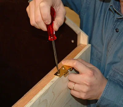 Keď je teraz strecha položená a vyrovnaná, zaznačte polohu závesov. Pomocou predpichovača vyznačte vonkajšiu stranu steny na spodnej hrane závesov. Strechu opäť odoberte a priskrutkujte závesy. Teraz možno zmontovať celú búdu a obrúsiť všetky hrany a rohy. Búdu opäť rozoberte a obrúste pomocou excentrickej brúsky všetky vonkajšie plochy.