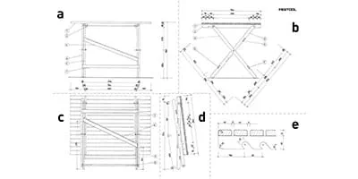 Spoje na podstavci sú takzvané plátovania. To znamená, že sa na každej doske odoberie polovica materiálu a obidva diely sa nakoniec zložia. Zaznačte presné polohy týchto spojov na nohách (pol. 3 + 4) a na vzperách (pol. 5, 6 + 7).