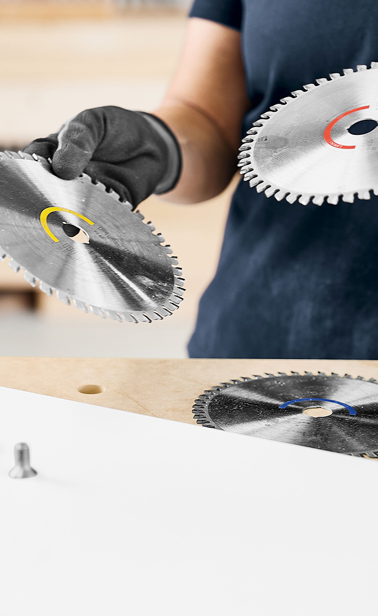 - Pre rezy, napríklad na nie viditeľných hranách alebo do hrubých materiálov, ako sú napr. OSB dosky, pri ktorých má rýchlosť prednosť pred reznou hranou bez ostrapov, stačí kotúč s menším počtom zubov.